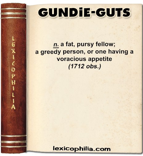 from Scottish gundie (greedy, voracious) + guts