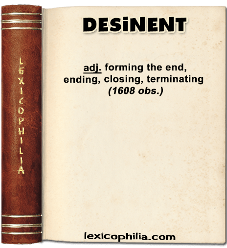 from Latin desinentem, present participle of desinere (to leave off, close),