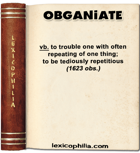 from Latin obgannire (to speak menacingly, to mutter or growl) + -ate