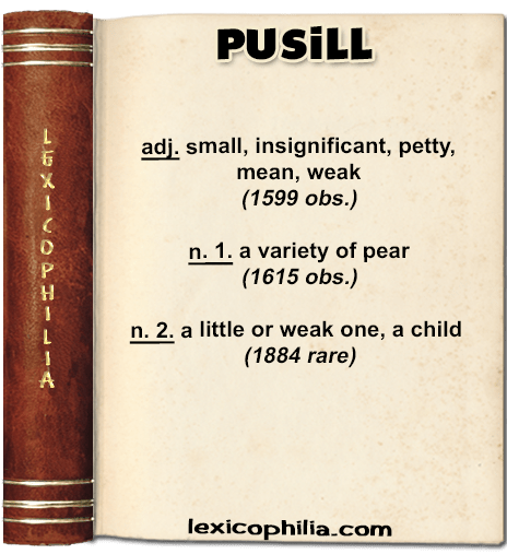 from: a) Middle French pusille, puzil, pusil (very small, weak),