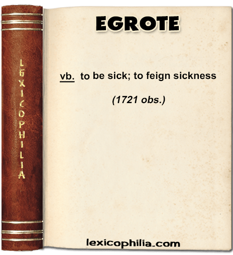 Word of the Day: EGROTE ETYMOLOGYfrom Latin ægrotare, from ægrotus (sick) EXAMPLECecil egroted to impress the new lady doctor. Share this: Click to email a link to a friend (Opens in new window) Email Click to print (Opens in new window) Print Click to share on Facebook (Opens in new window) Facebook Click to share on Reddit (Opens in new window) Reddit Click to share on Pinterest (Opens in new window) Pinterest Click to share on Tumblr (Opens in new window) Tumblr Click to share on X (Opens in new window) X Click to share on WhatsApp (Opens in new window) WhatsApp Like Loading...