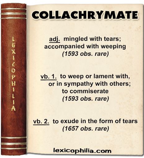 vb. : from Latin collacrimat- ppl. stem of collacrimare, from col- (together) + lacrimāre (to shed tears, weep), from lacrima (tear)