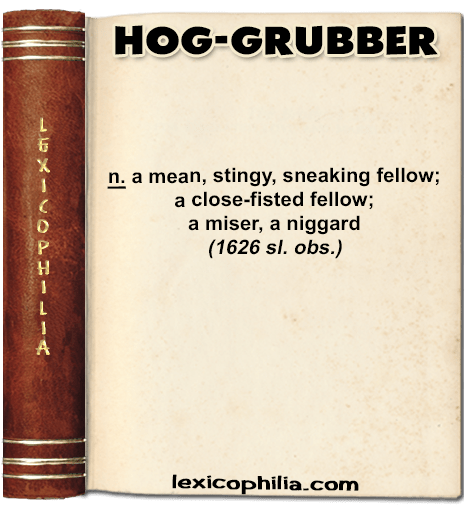 from hog + grubber (a person who gets wealth by sordid or contemptible methods)