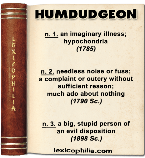 from hum (a piece of humbug, an imposition, a hoax) + dudgeon (a feeling of anger, resentment, offense)