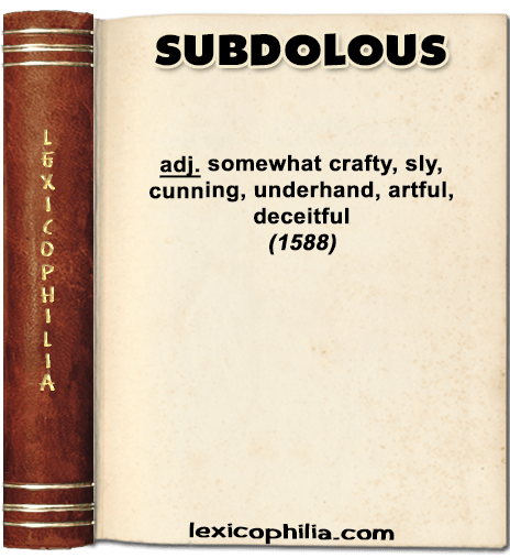 or from classical Latin subdolus (sly, deceitful, treacherous) (from sub- (sub-) + dolus (dole – the corrupt, malicious, or evil intention essential to the guilt of a crime)) + -ous