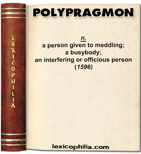 from Greek πολυπράγµων )busy about many things, meddlesome, officious),