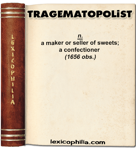 from Latin tragematopola (sweet seller) or its etymon, Greek τραγηματοπώλης (seller of sweetmeats),