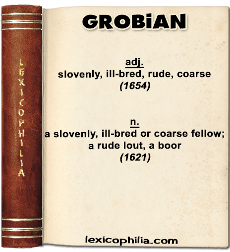 from German Grobian, from medieval Latin Grobianus, name of an imaginary personage, often referred to by writers of the 15th – 6th century in Germany as the type of boorishness,