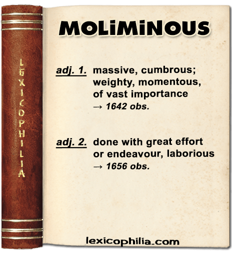 from Latin molimin- molimen (effort); (from moliri (to make an effort, undertake, attempt)) + -ous