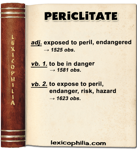 vb: from Latin periclitat-, past participial stem of periclitari (to expose to risk, danger, or peril), from periculum, periclum (trial, risk, danger)