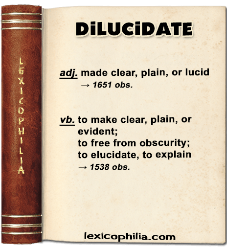 adj.: from Latin dilucidatus, past participle of dilucidare (to make clear, to explain), from dilūcidus (clear, bright)