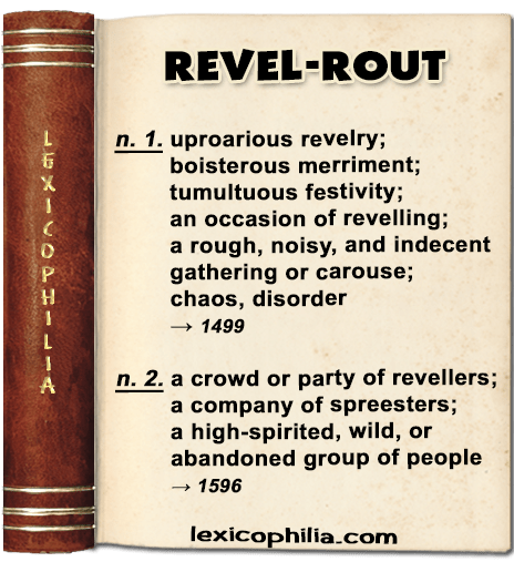 from revel (exuberant merrymaking) + rout (a company or assemblage of persons)