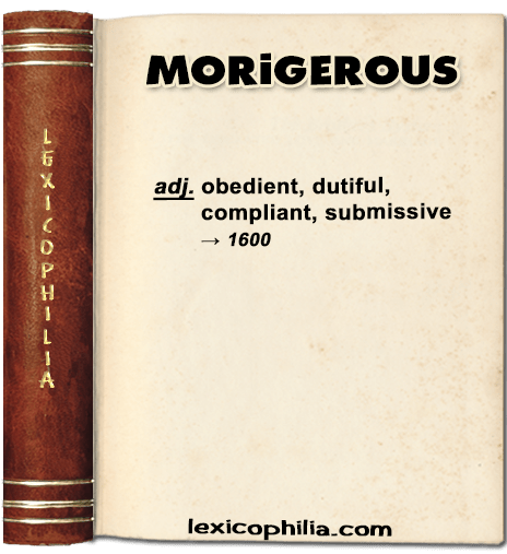 from Latin morigerus (compliant, obliging), (from mor-, mos [custom, humour] + gerere [to bear, carry]; after the phrase morem gerere [to humour or comply with the wishes of a person]) + -ous