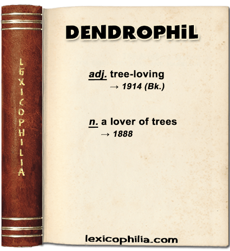 from Greek δένδρον (dendron) (tree) + philos/phile (loving, fond of; lover)
