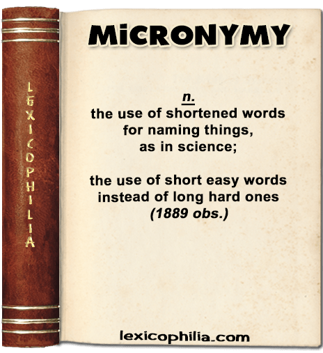 from Greek µῑκρός (small) + ὄνυµα (name), ὄνοµα, after synonymy, etc.