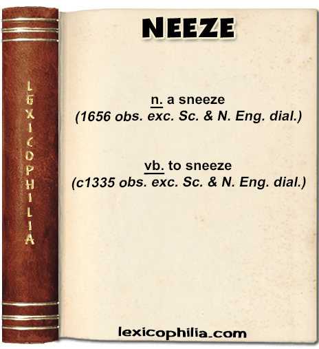 From Oxford English Dictionary: either from early Scandinavian (compare Old Icelandic hnjósa , Norwegian nyse , †njosa , Old Swedish niusa (Swedish nysa ), Danish nyse ), or the reflex of an unattested Old English word from the same Germanic base, as is perhaps suggested by the number of cognates in other West Germanic languages: Middle Dutch niesen (Dutch niezen ), Middle Low German nēsen , neysen , neesen , etc., Old High German niesan , niosan , niusan (German niesen)